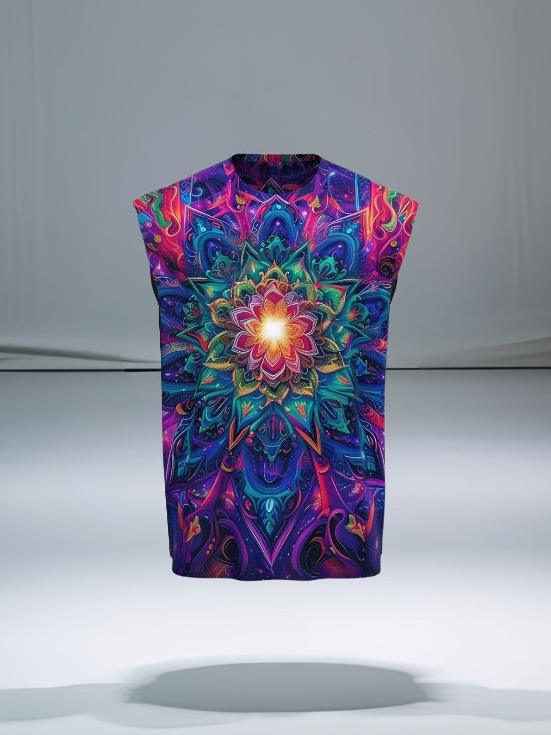 ย featuring a captivating mandala design that glows in vibrant purples and blues. This vest is a wearable piece of art, bringing an aura of calm yet powerful energy to your wardrobe. Perfect for adding a pop of energy to your outfit, this vest is both comfortable and eye-catching.ย ย