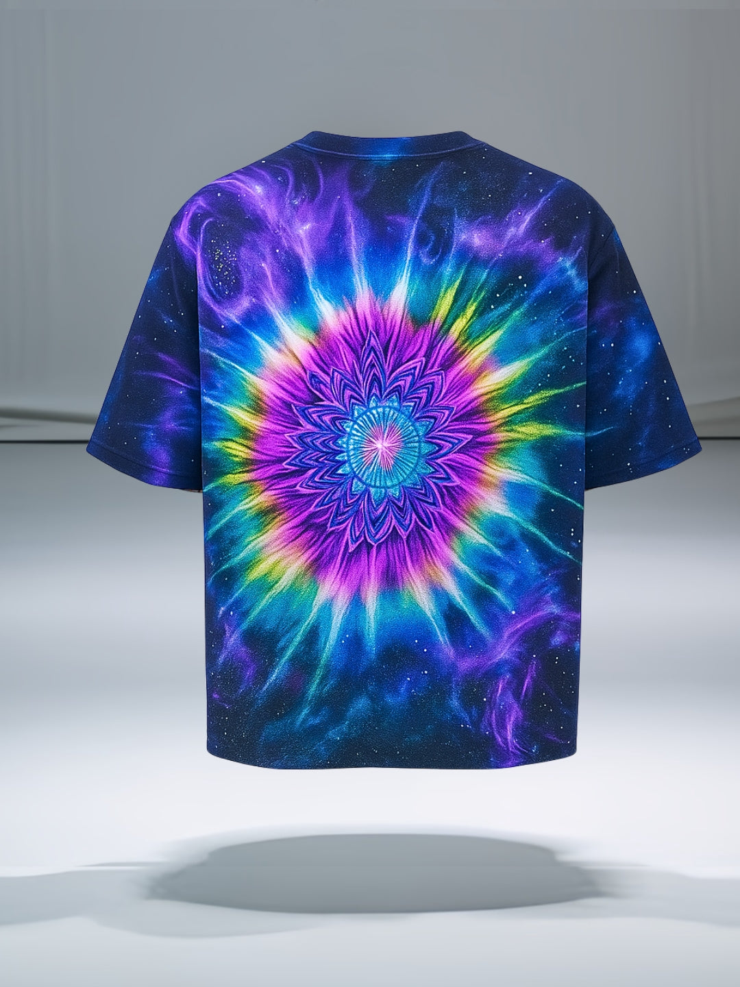 A striking mandala print radiates from the back of this unisex oversized tee, blending vibrant layers of color with cosmic depth. Designed for comfort and statement, the relaxed silhouette drapes effortlessly on all bodies — bold, breathable, and built to stand out.
