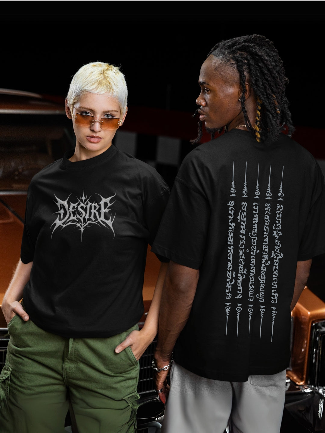 Fuel your inner fire with the Dark Desire Oversized Tee — a unisex essential built for bold expression. Featuring a striking "DESIRE" print on the front and cryptic back graphics inspired by ancient scripts, this tee merges street style with raw emotion. Finished in premium black with a relaxed oversized fit for all-day comfort and attitude.