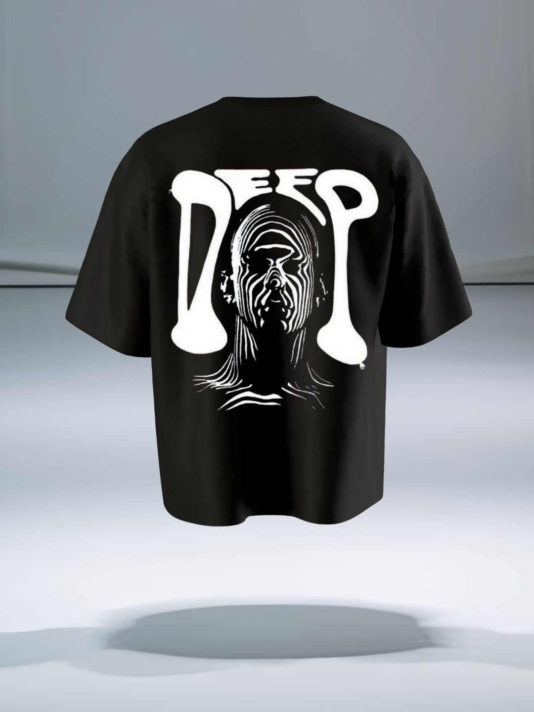 Unisex oversized classic t-shirt featuring a bold mind-bending "DEEEP" Thought Graphics with a hypnotic face design on the back & a minimalist heart-sun design on the font. Made for those who vibe deeper.