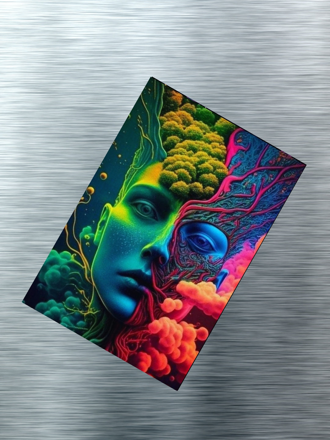 Euphoric Mindshift is a striking metal poster that blends neon dreamscapes with organic surrealism, creating a portal to altered perception. A must-have for those who embrace the trippy and the transcendent.