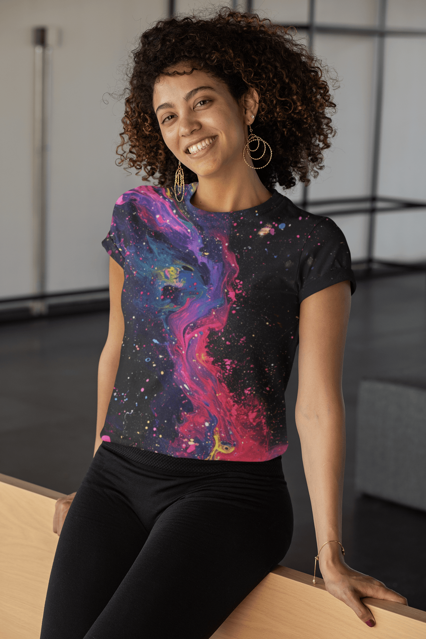 Embrace the cosmos with our Galactic Swirl Women's T-Shirt. This vibrant tee features a mesmerising swirl of galactic colors, blending rich purples, pinks, and blues in a stunning cosmic pattern. Made from soft, high-quality fabric, it offers both comfort and style. Perfect for casual outings or making a statement, this t-shirt is a must-have for any space enthusiast or fashion-forward individual.