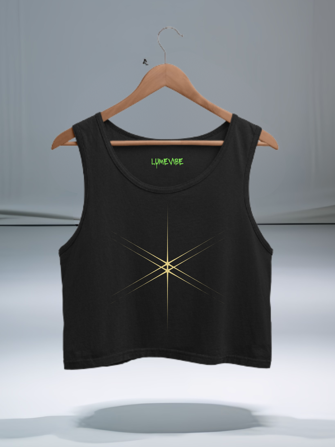 Designed for those who radiate confidence, this sleek crop features a sharp golden starburst that catches the light just right. Whether you're out vibing or keeping it chill, this piece adds the perfect touch of cosmic elegance to your look. ✨