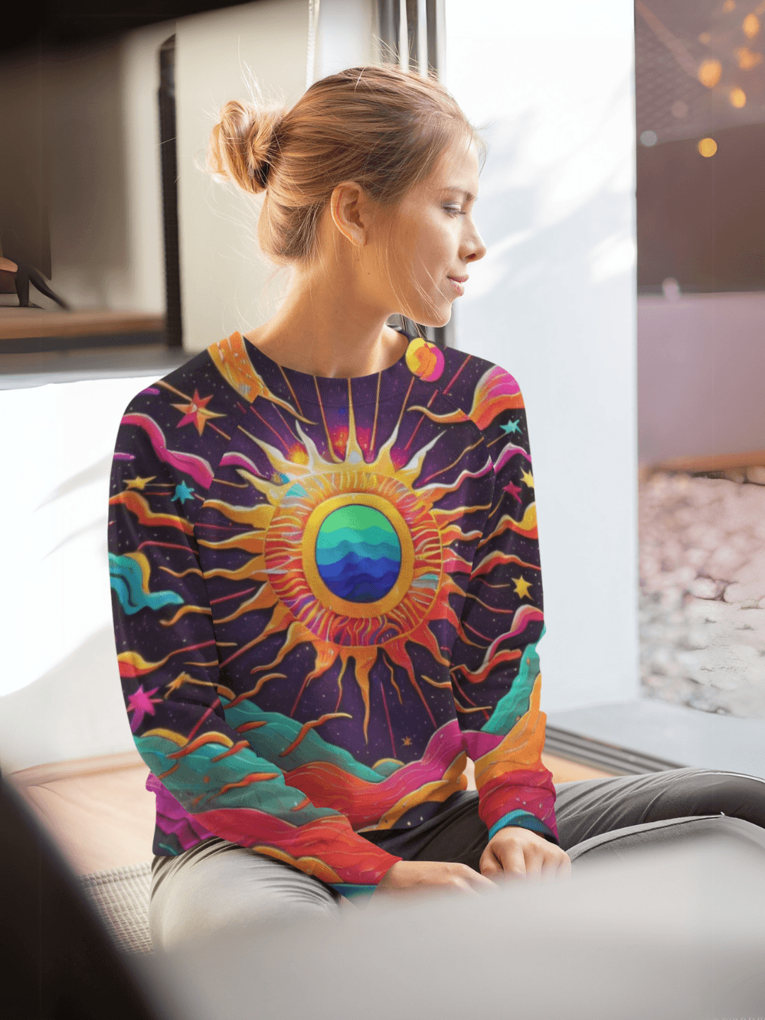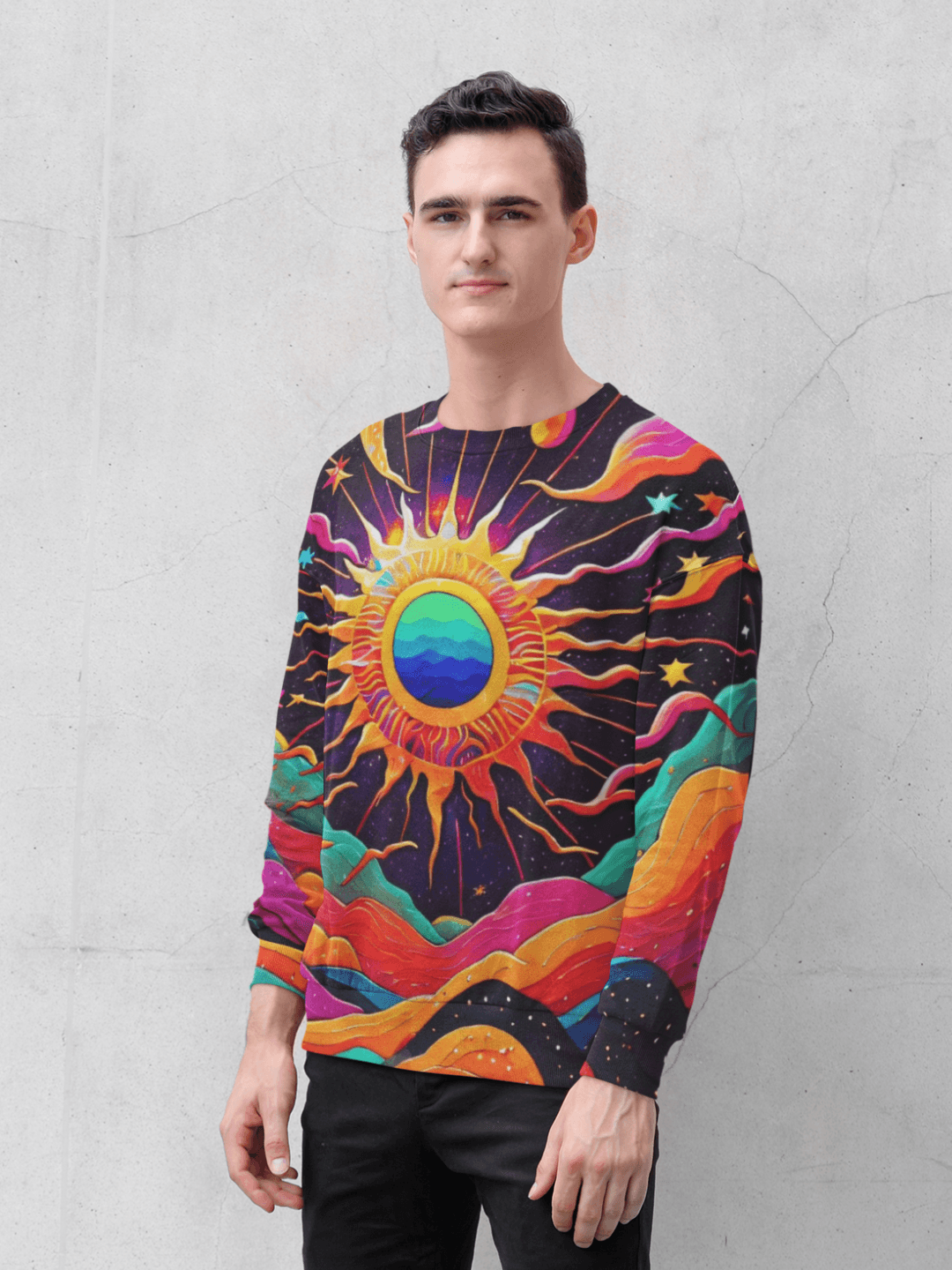 a world of vibrant imagination with the Horizon Dreams Full-Sleeve Tee. Showcasing a radiant sun and celestial accents, this tee blends comfort and bold artistry, perfect for those who love to shine bright.