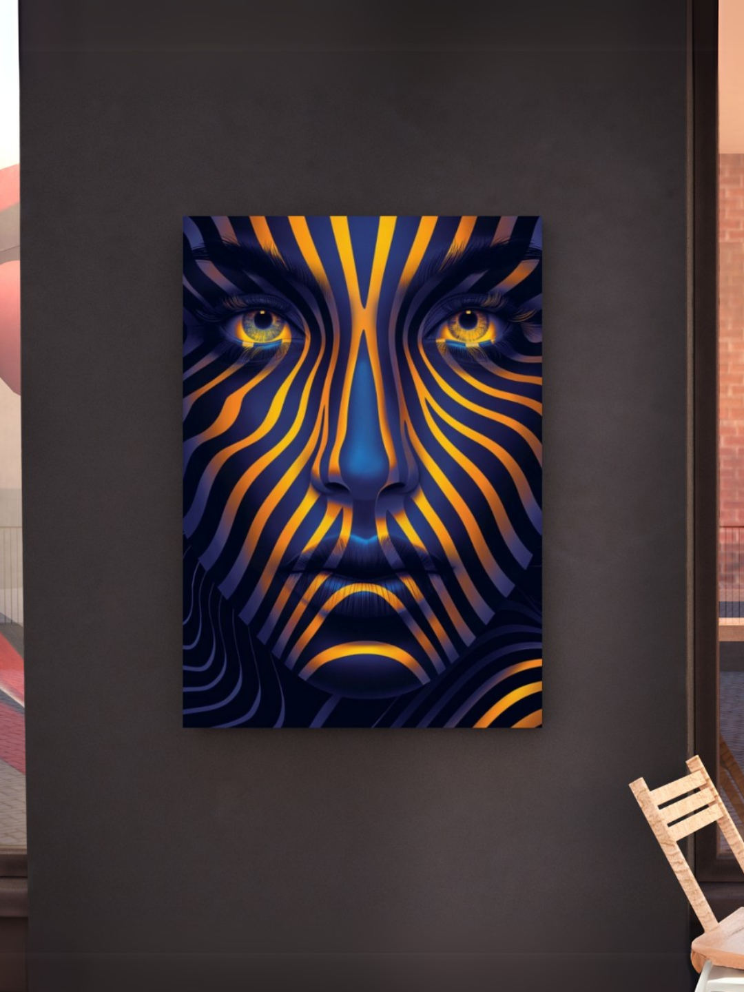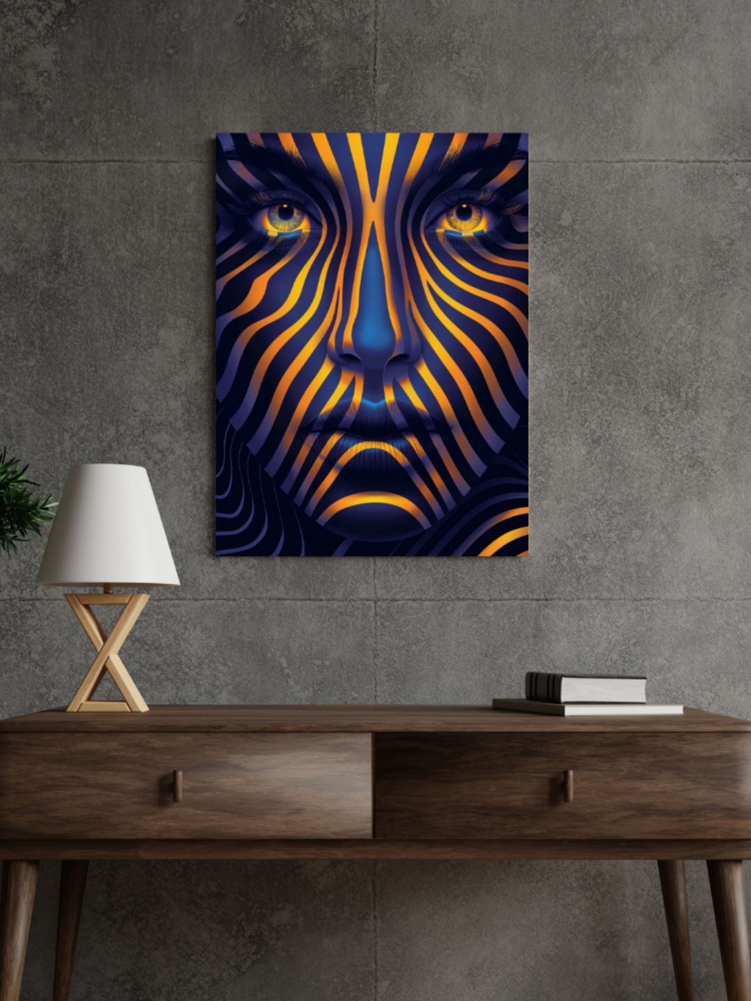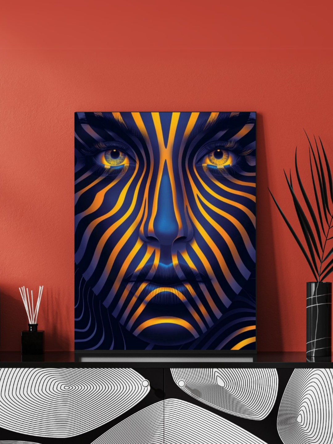 Hypnotic Veil is a surreal psychedelic wall art that merges human expression with fluid motion. Bold strokes of gold and deep blue shape an abstract face, evoking emotion and depth. This framed canvas art adds a hypnotic, dreamlike energy to any room