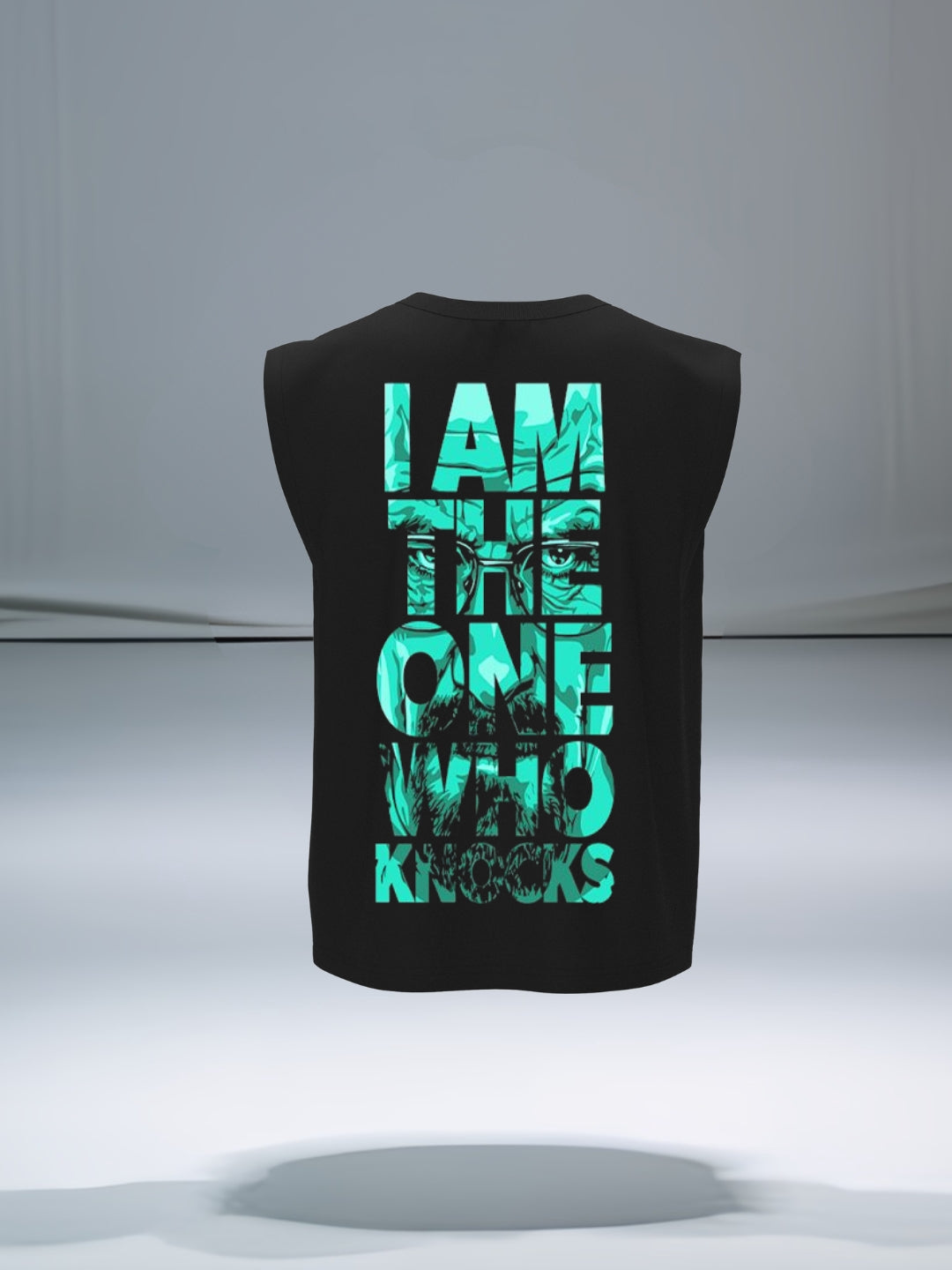 Channel raw confidence with the Knock Code Vest. Made from premium cotton, this black sleeveless piece features a bold cyan graphic that declares, "I Am the One Who Knocks"—a nod to power, presence, and unshakable energy.