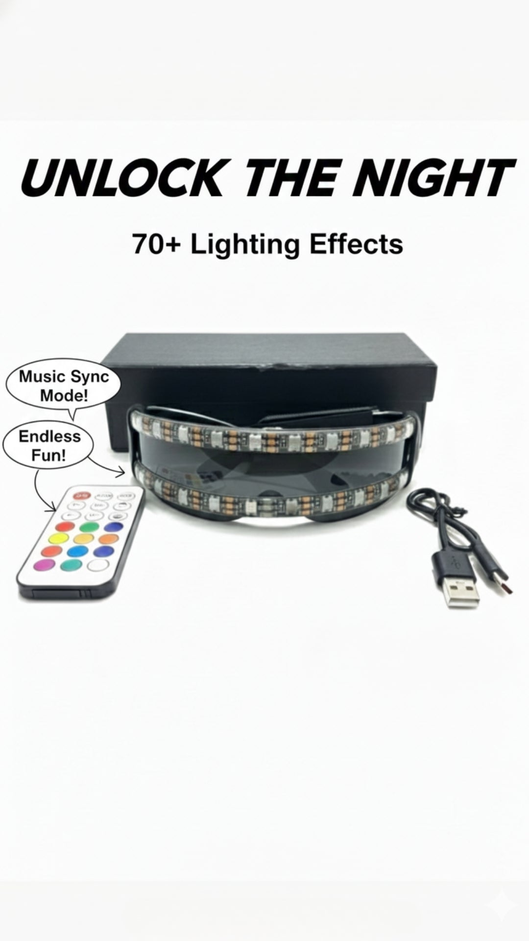Step into the future with the LuminoSync LED Party Glasses! These rechargeable glasses feature an impressive 12 built-in effects and 9 dynamic colors. With remote control access to 12 additional colors and 72 customizable effects, you can sync up your look to any vibe. Perfect for parties, festivals, and standing out in style, these futuristic glasses are designed to light up any event with dazzling, eye-catching displays.