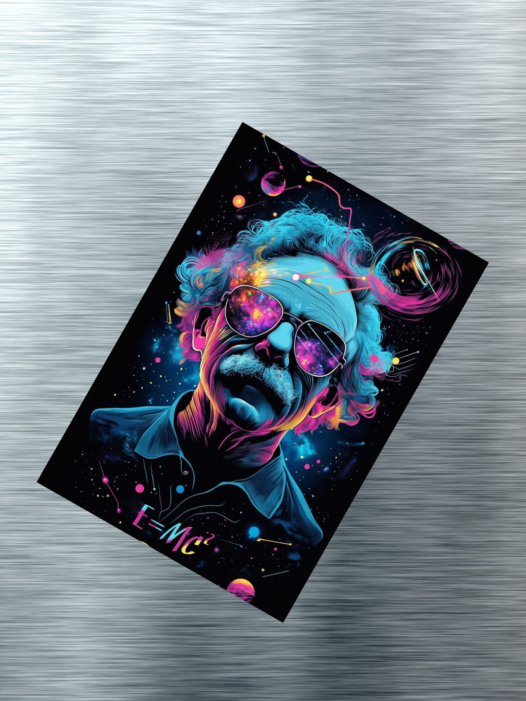 striking metal poster that blends science with a neon dreamscape. Featuring a vibrant, futuristic portrayal of Einstein with cosmic reflections in his shades, this 1mm thick aluminum print radiates energy and intellect.