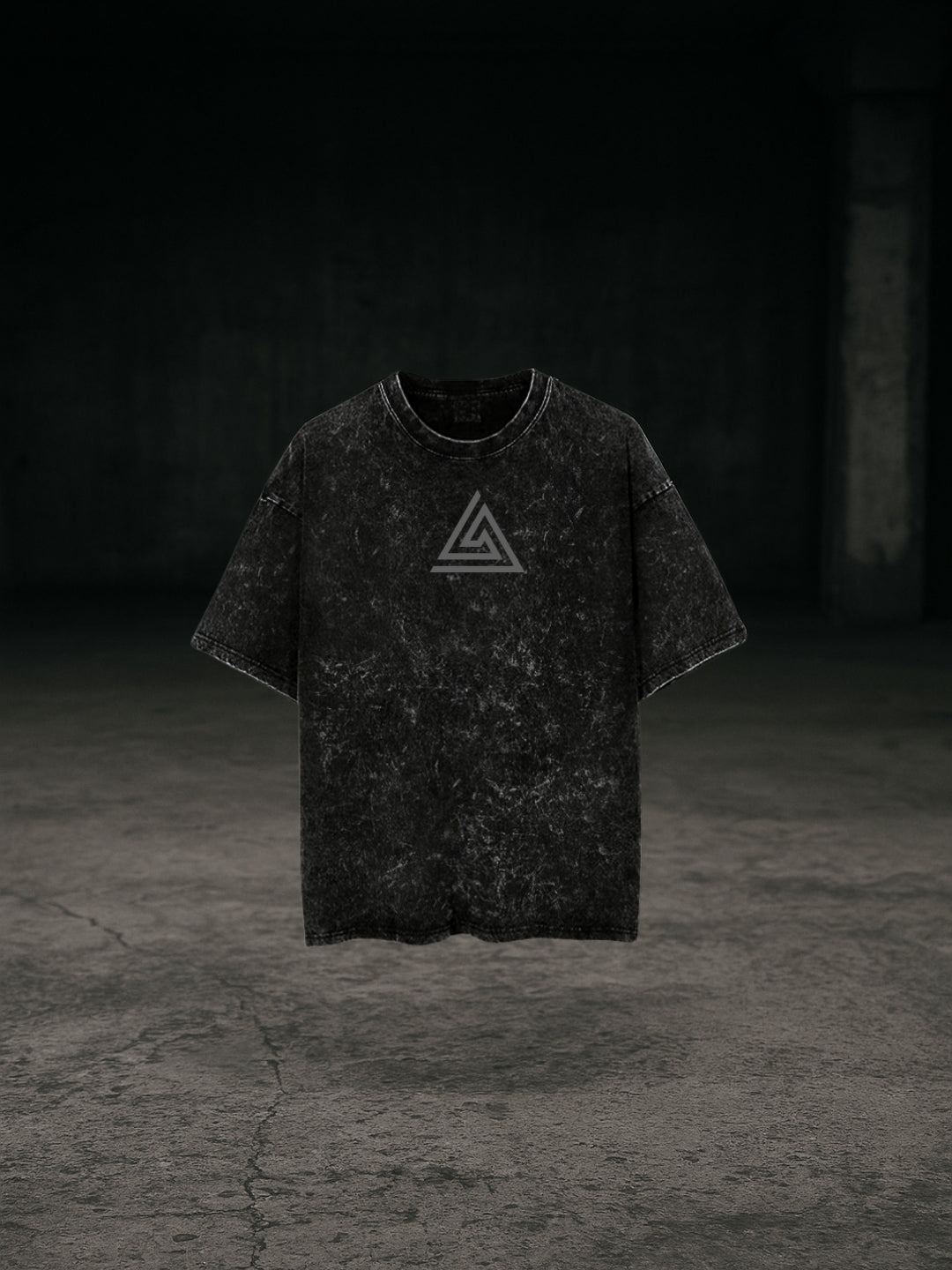 This unisex oversized tee crafted in a unique black stone/acid wash finish. The centered monogram symbol represents balance and strength, adding a positive touch of meaning to your look.