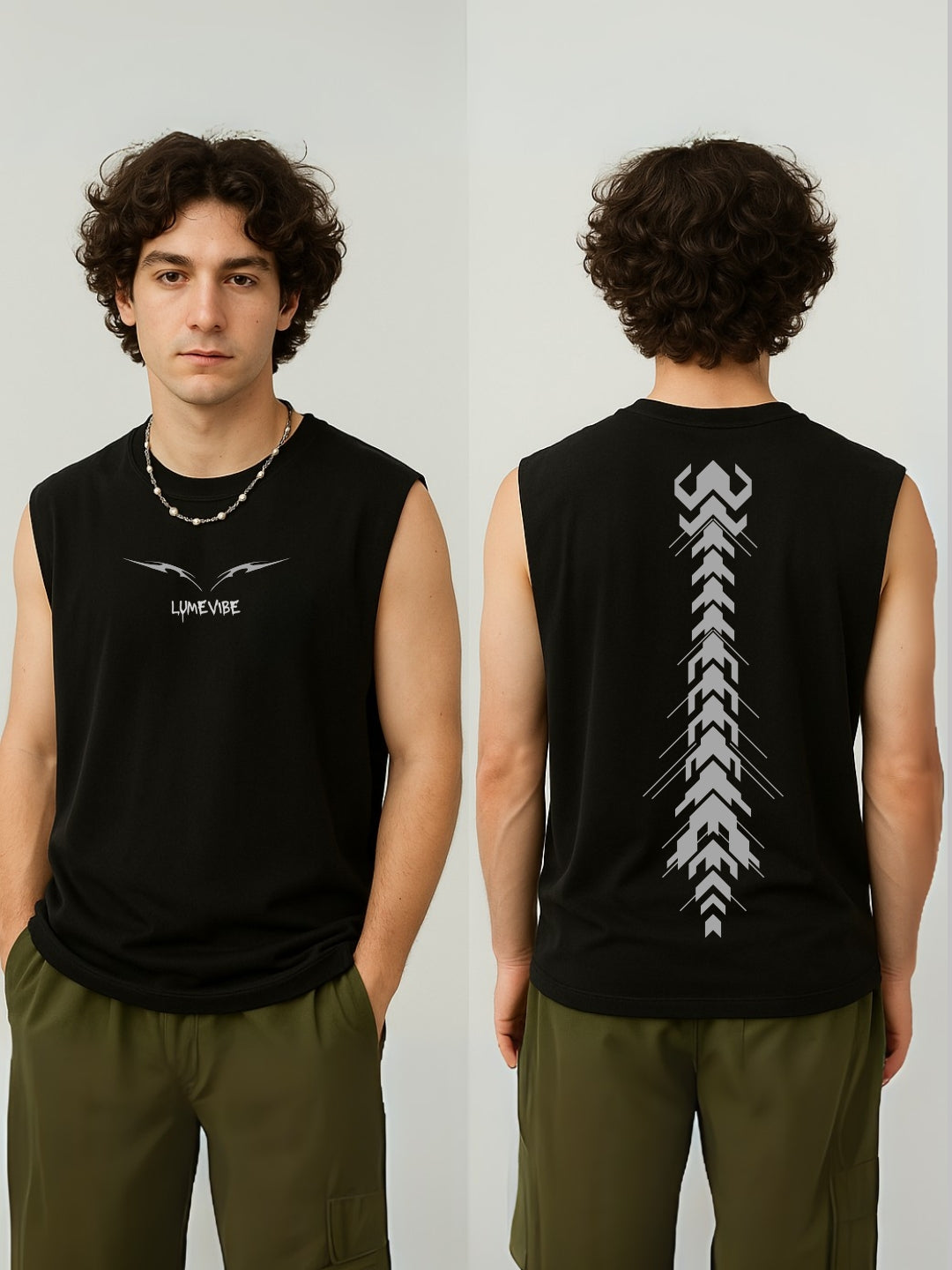 Featuring a bold, glow-in-the-dark spine graphic on the back and sharp neon accents on the chest, this black muscle-fit vest is made to stand out at raves, parties, or anywhere you own the dark.