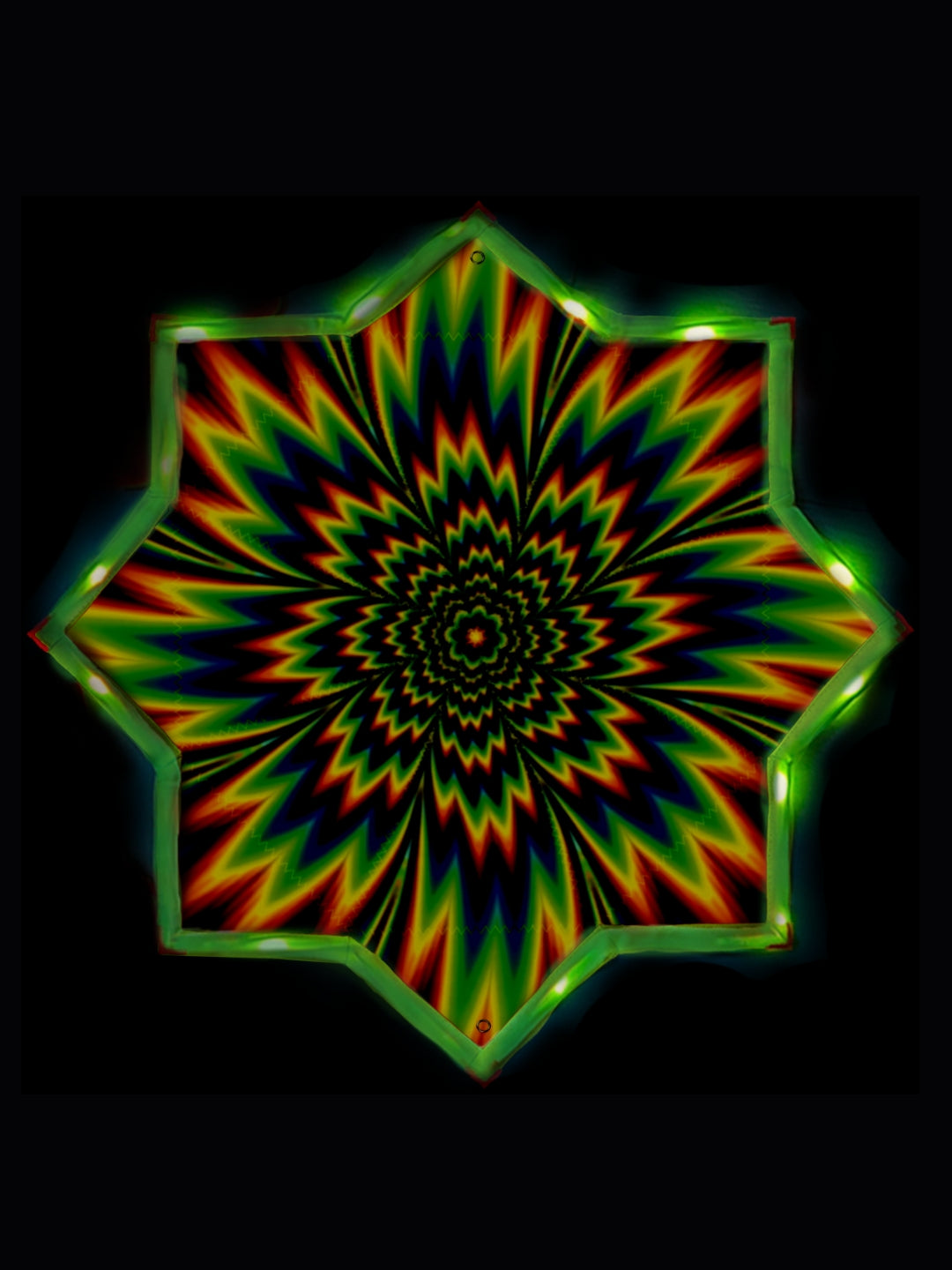 Green & Multi color Glow star: Green/Multi color LED's, UV-reactive front, fluorescent yellow back, matching borders, Velcro + snap buttons