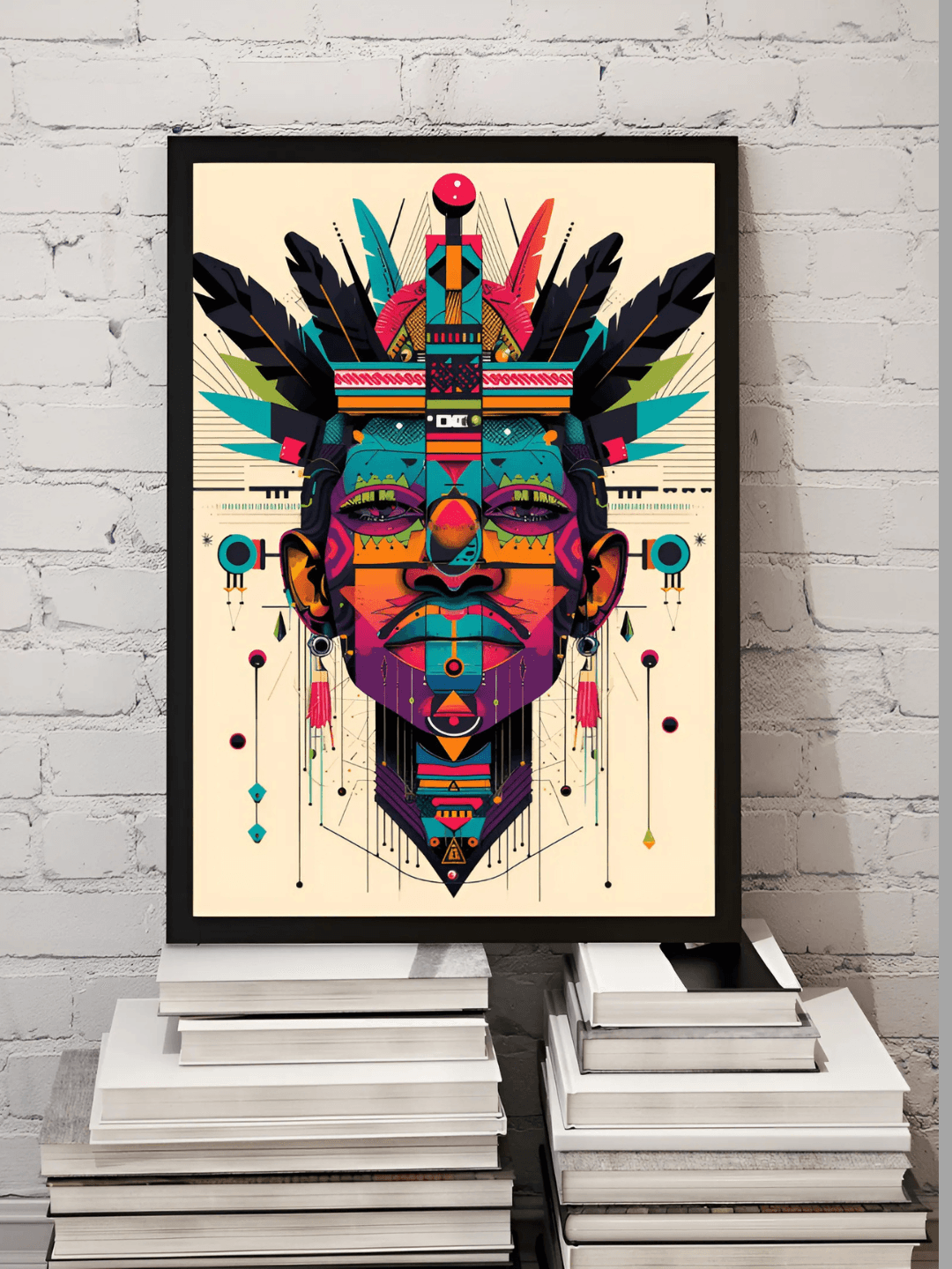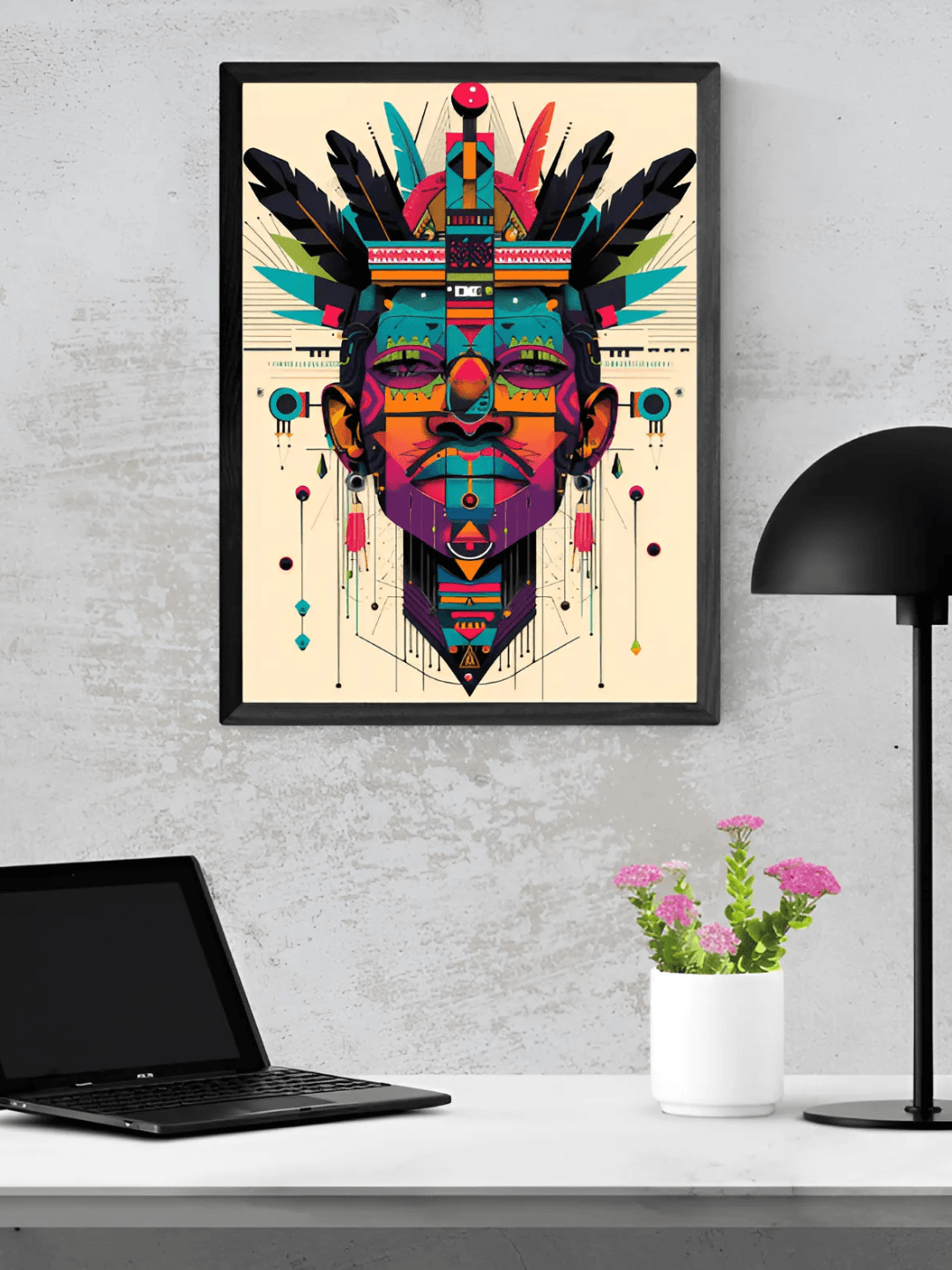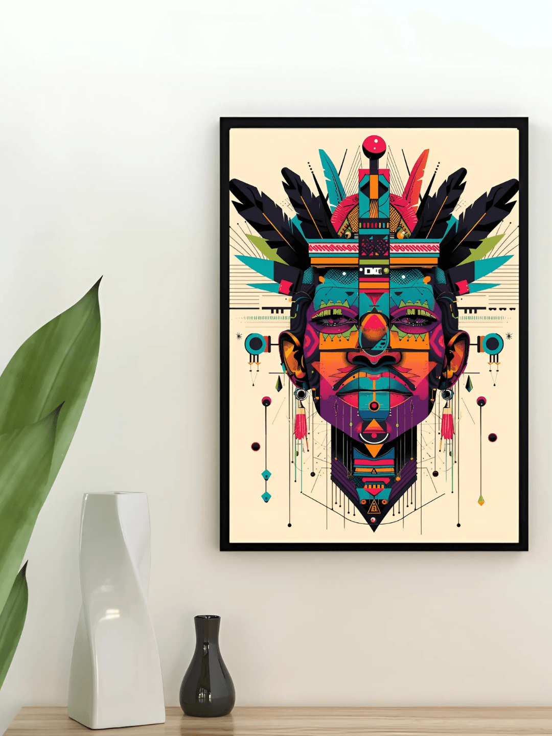 This framed art captures the vibrant essence of modern tribal aesthetics, featuring a symmetrical, geometric face adorned with vivid colors, feathers, and intricate details. Perfect for adding bold, artistic energy to any space.