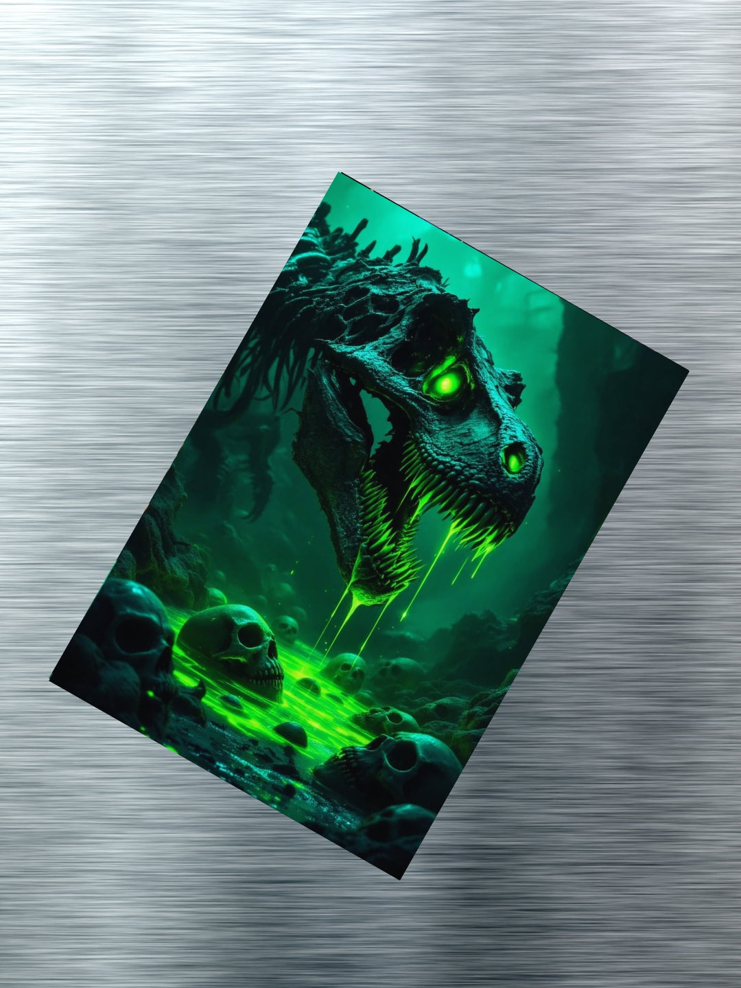 This metal poster showcases a fierce, skeletal dinosaur with glowing green eyes and toxic fangs, set in a haunting neon-lit wasteland. A bold statement piece for any dino lover or dark art enthusiast.